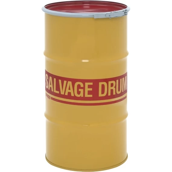 - High-visibility yellow with red “Salvage Drum” markings clearly identify drum