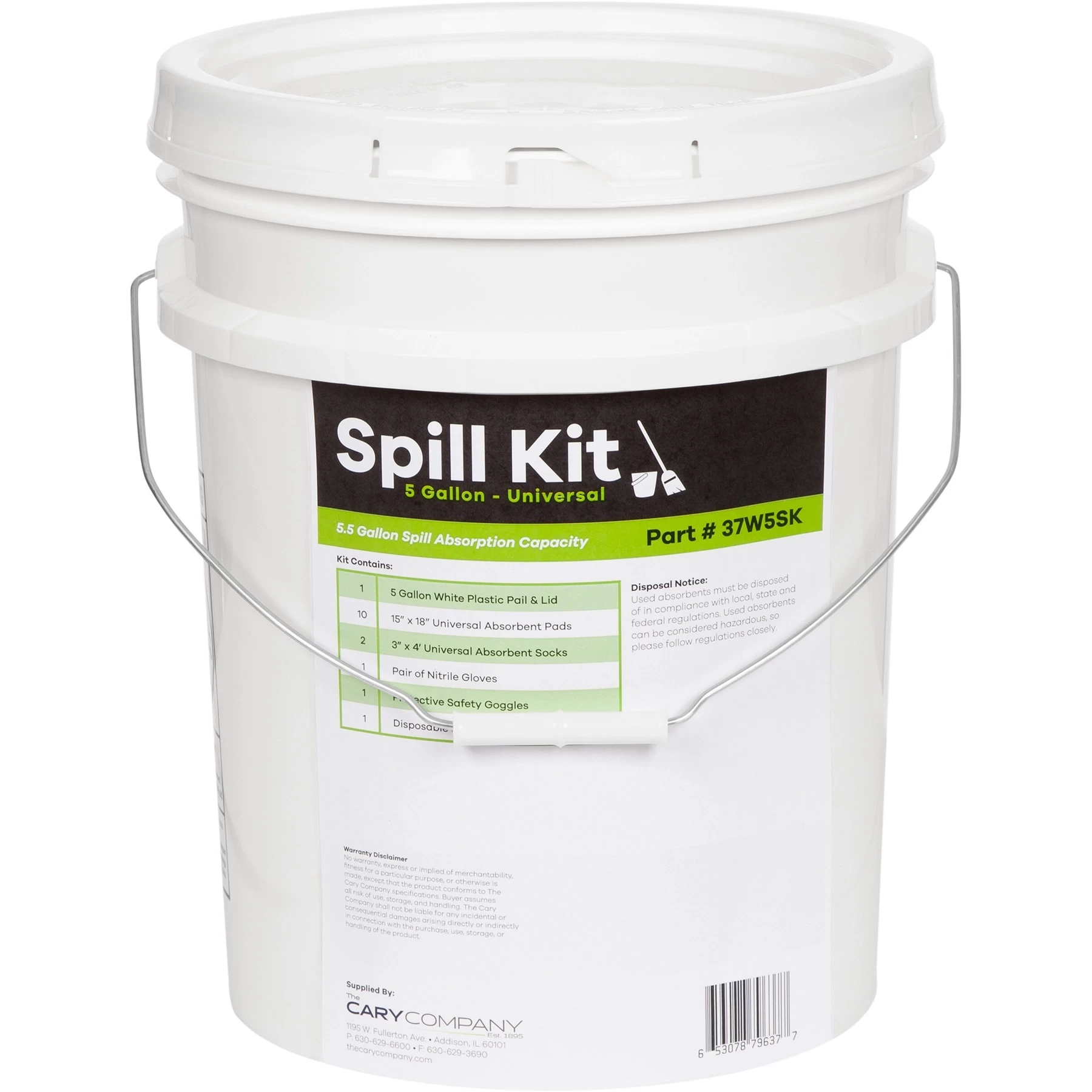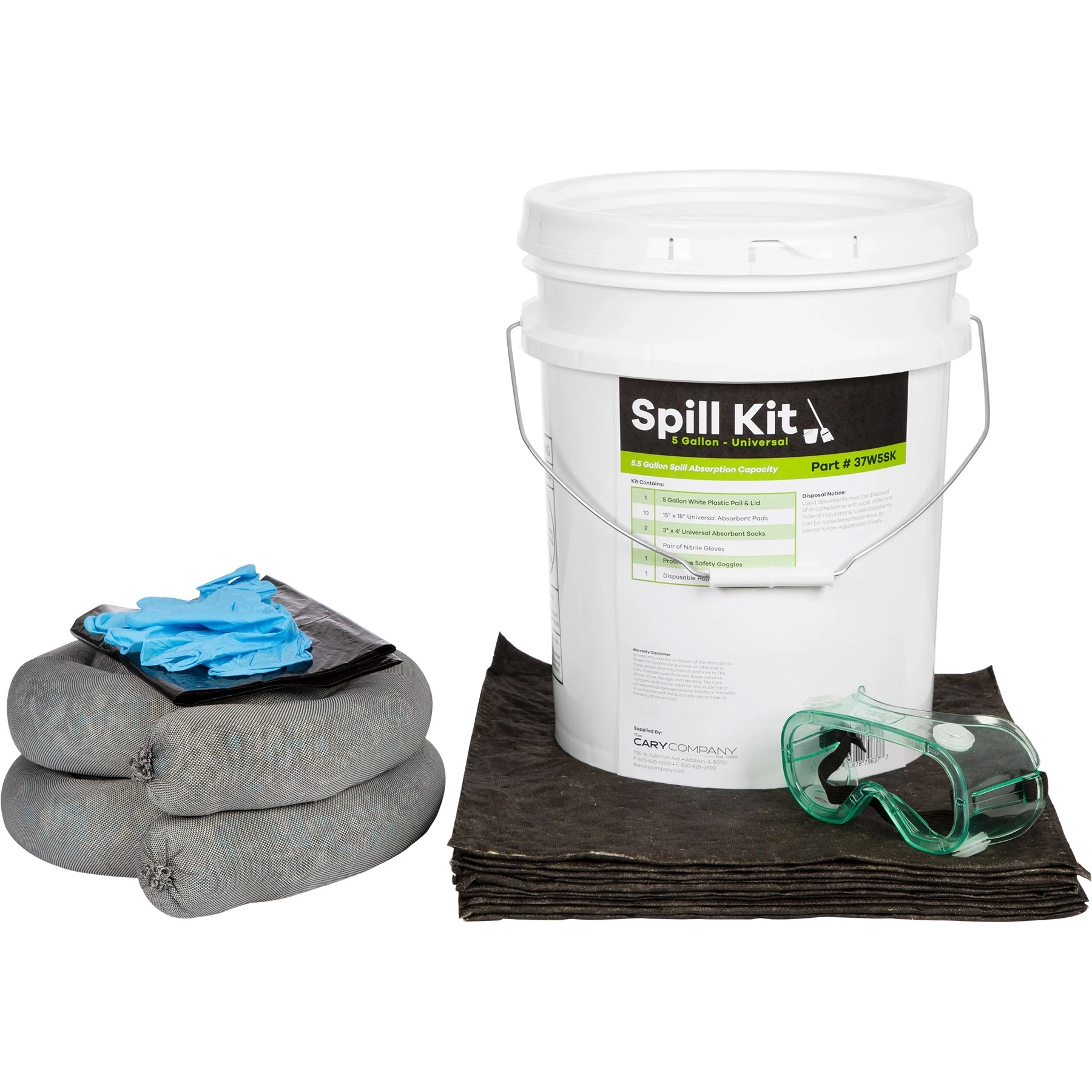 5 gallon white regrind HDPE (high-density polyethylene) round pail (90 mil wall thickness) & plastic regrind round lid for 5 gallon plastic pails comes with a metal handle. It provides a convenient storage solution for your spill kit on the road or in your work place. Not FDA Compliant. - Proudly Made in the USA. The Cary Company builds each spill kit locally in Addison, Illinois.